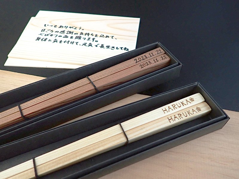 百年杉のお箸は耐久性があり、使い心地も抜群です。名入れやメッセージ、イニシャル、ワンポイントなどを焼き入れてオリジナルのものに仕上げていただくこともできます。ご夫婦でのご参加、結婚祝いや両親へのプレゼントに!是非ご参加ください。皆さまのご来店、心よりお待ちしております。